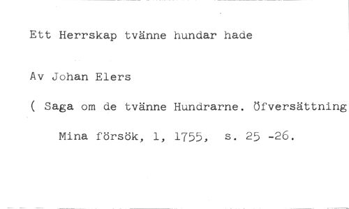 Ett Herrskap tvänne hundar hade //// Av Johan Elers //// ( Saga om de tvänne Hundrarne. öfversättning Mina försök, 1, 1755, s. 25 -26.
