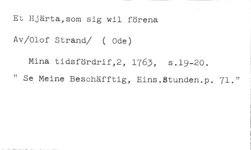 Et Hjärta,som sig wil förena Av/Olof Strand/ ( Ode) //// Mina tidsfördrif,2, 1763, s.19-20. //// " Se Meine Beschäfftig, Eins.Stunden.p. 71."