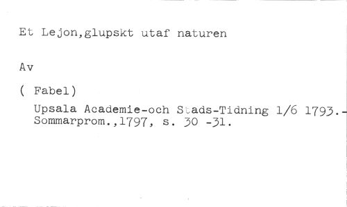 Et Lejon,glupskt utaf naturen //// Av //// ( Fabel) //// Upsala Academie-och Sads-Tidning 1/6 1793.t Sommarprom.,1797, s. 30 -31.