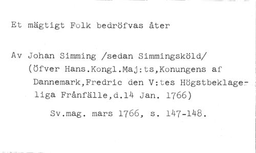 Et mägtigt Folk bedröfvas åter //// Av Johan Simming /sedan Simmingsköld //// /(öfver Hans.Kongl.Maj:ts,Konungens af Dannemark,Fredric den V:tes Högstbeklageliga Frånfälle,d.14 Jan. 1766) //// Sv.mag. mars 1766, s. 147-148.