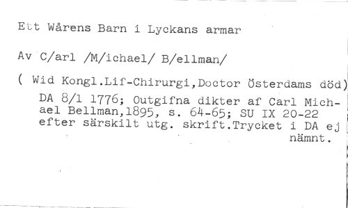 Eut Wårens Barn i Lyckans armar //// Av C/arl /M/ichael/ B/ellman //// /( Wid Kongl.Lif-Chirurgi,Doctor Österdams död) //// DA 8/1 1776; Outgifna dikter af Carl Michael Bellman,1895, s. 64-65; SU IX 20-22 efter särskilt utg. skrift.Trycket i DA ej //// nämnt.
