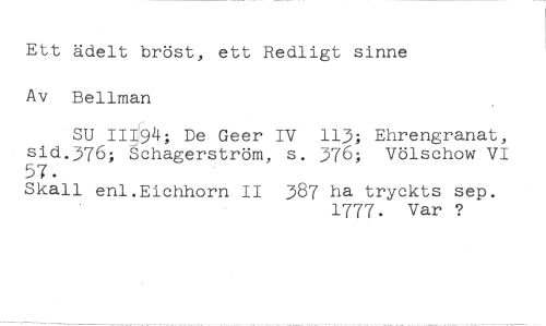 Ett ädelt bröst, ett Redligt sinne Av Bellman //// SU III94; De Geer IV 113; Ehrengrariat, sid.376; Schagerström, s. 376; Völschow VI //// 57. //// Skall enl.Eichhorn II 387 ha tryckts sep. //// 1777. Var ?