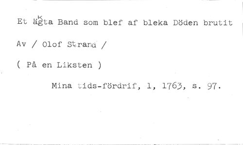 Et äta Band som blef af bleka Döden brutit //// Av / Olof Strand / ( På en Liksten //// Mina ,,ids-fördrif, 1, 1763, s. 97.