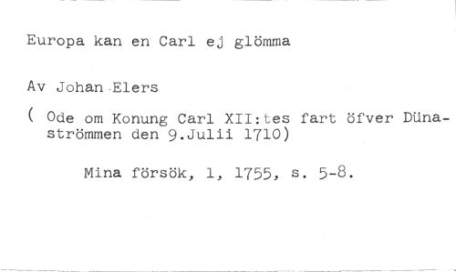 Europa kan en Carl ej glömma Av Johan -Elers //// ( Ode om Konung Carl XII:tes fart öfver DUnaströmmen den 9.Julii 1710) //// Mina försök, 1, 1755, s. 5-8.