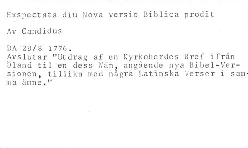 Exspectata diu Nova versio Biblica prodit Av Candidus //// DA 29/8 1776. //// Avslutar "Utdrag af en Kyrkoherdes Bref ifrån Öland til en dess Wän, angående nya Bibel-Versionen, tillika med några Latinska Verser i samma ämne."