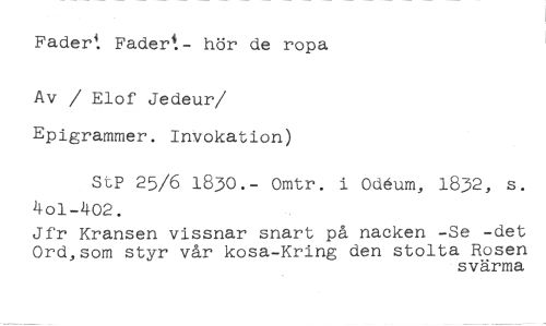 Fader t Fadert- hör de ropa //// Av / Elof Jedeur //// /Epigrammer. Invokation) //// StP 25/6 1830.- Omtr. i OcAum, 1832, s. //// 4o1-402. //// Jfr Kransen vissnar snart på nacken -Se -det //// Ord,som styr vår kosa-Kring den stolta Rosen //// svärma