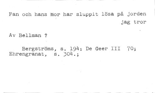Fan och hans mor har sluppit lösa på jorden //// jag tror //// Av Bellman ? //// Bergströms, s. 194: De Geer III 70; Ehrengranat, s. 304.;