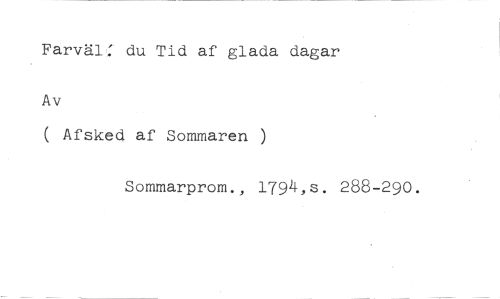Farväl: du Tid af glada dagar //// Av //// ( Afsked af Sommaren ) //// Sommarprom., 1794,s. 288-290.