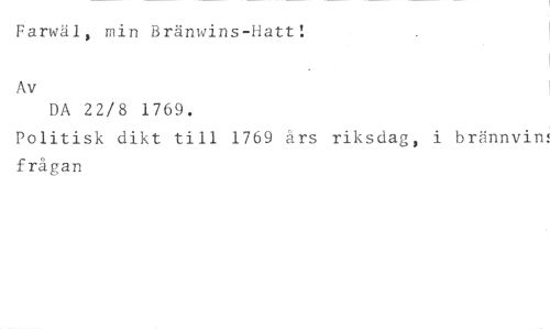Farwäl, min Bränwins-Hatt! //// Av //// DA 22/8 1769. //// Politisk dikt till 1769 års riksdag, i brännvin! frågan