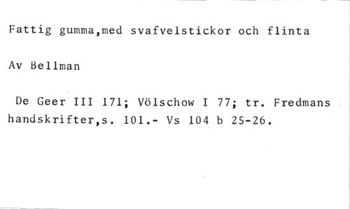 Fattig gumma,med svafvelstickor och flinta //// Av Bellman //// De Geer III 171; Völschow I 77; tr. Fredmans handskrifter,s. 101.- Vs 104 b 25-26.