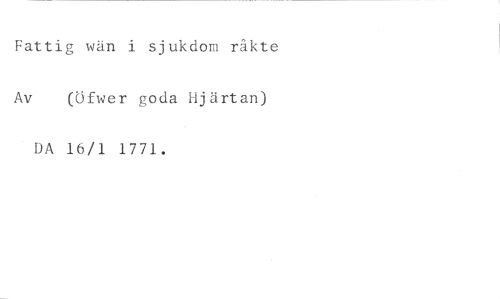 Fattig wän i sjukdom rökte //// Av (Öfwer goda Hjärtan) //// DA 16/1 1771.