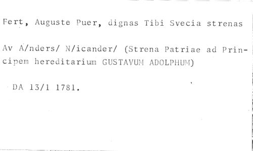 Fert, Auguste Puer, dignas Tibi Svecia strenas //// Av Onders/ N/icander/ (Strena Patriae ad Principem hereditarium GUSTAVUM ADOLPHUM) //// DA 13/1 1781.