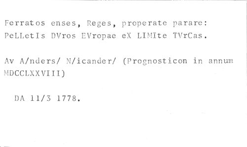 Ferrat os enses, Reges, properate parare: PeLLetIs DVros EVropae eX LIMIte TVrCas. //// Av A/nders/ N/icander/ (Prognosticon in annum MDCCLXXVIII) //// DA 11/5 1778.