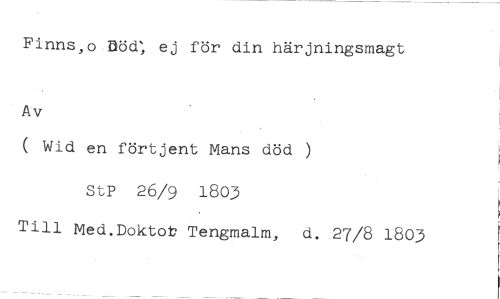 Finns,o nöd, ej för din härjningsmagt //// Av //// ( Wid en förtjent Mans död ) //// StP 26/9 1803 //// Till Med.Doktot Tengmalm, d. 27/8 1803