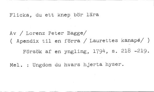 Flicka, du ett knep bör lära //// Av / Lorenz Peter Bagge //// /( Apendix til en förra / Laurettes kanalA/ ) //// Försök af en yngling, 1794, s. 218 -219. Mel. : Ungdom du hvars hjerta hyser.
