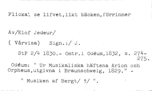 Flicka: se lifvet,likt bäcken,förrinner //// Av/Elof Jedeur //// /( Vårvisa) Sign.:/ J. //// StP 2/L1 1830.- Omtr.i Od6um,1832, s. 274- //// 275. //// 0c16.1m: " Ur Musikaliska häftena Arion och Orpheus,utgivna i Braunschweig, 1829." - //// " Musiken af Bergt/ ?/ ".