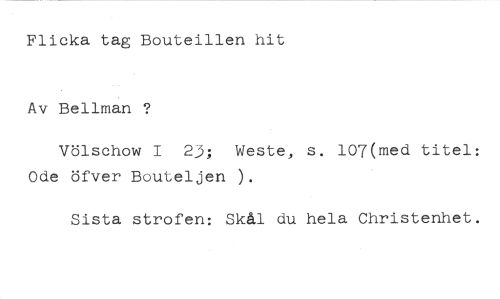 Flicka tag Bouteillen hit //// Av Bellman ? //// Völschow I 23; Weste, s. 107(med titel: Ode öfver Bouteljen ). //// Sista strofen: Skål du hela Christenhet.