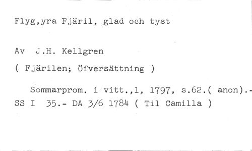 Flyg,yra Fjäril, glad och tyst //// Av J.H. Kellgren //// ( Fjärilen; Öfversättning ) //// Sommarprom. i vitt.,l, 1797, s.62.( anon).- SS I 35.- DA 3/6 1784 ( Til Camilla )