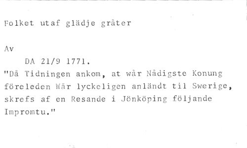Folket utaf glädje gråter //// Av //// DA 21/9 1771. //// "Då Tidningen ankom, at wår Nådigste Konung föreleden Wår lyckeligen anländt til Swerige, skrefs af en Resande i Jönköping följande Impromtu."