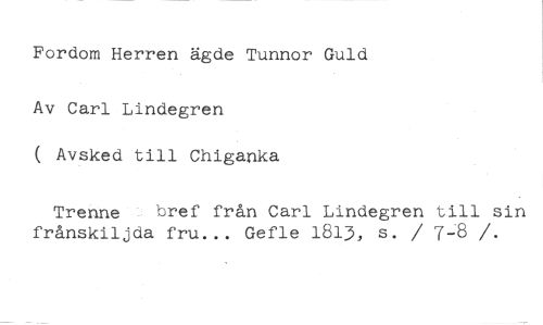 Fordom Herren ägde Tunnor Guld //// Av Carl Lindegren //// ( Avsked till Chiganka //// Trenne bref från Carl Lindegren till sin frånskiljda fru... Gefle 1813, s. / 7-8 /.