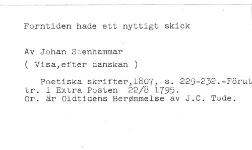 Forntiden hade ett nyttigt skick //// Av Johan Senhammar //// ( Visa,efter danskan ) //// Poetiska skrifter,1807, s. 229-232.-Förut tr. i Extra Posten 22/8 1795. //// Or. är Oldtidens BerOmmelse av J.C. Tode.