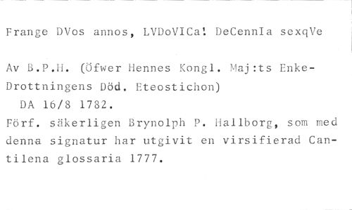 Frange DVos annos, LVDoVICal DeCennla sexciVe //// Av B.P.H. (Öfwer Hennes Kongl. Maj:ts EnkeDrottningens Död. Eteostichon) //// DA 16/8 1782. //// Förf. säkerligen Brynolph P. Hallborg, som med denna signatur har utgivit en virsifierad Cantilena glossaria 1777.