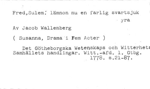 Fred,Sulem: lämnon nu en farlig svartsjuk //// - yra //// Av Jacob Wallenberg //// ( Susanna, Drama-i Fem Acter ) //// Det Götheborgska Wetenskaps och Witterhet: Samhällets handlingar. Witt.-afd. 1. Gtbg. //// 1778. s.21-87.