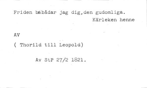 Friden beLbådar jag dig,den gudomliga. //// Kärleken henne //// AV //// ( Thorild till Leopold) //// Av StP 27/2 1821.