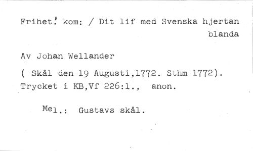 Frihet! kom: / Dit lif med Svenska hjertan //// blanda //// Av Johan Wellander //// ( Skål den 19 Augusti,1772. SthM 1772). Trycket i KB,Vf 226:1., anon. //// Mel.: Gustavs skål.