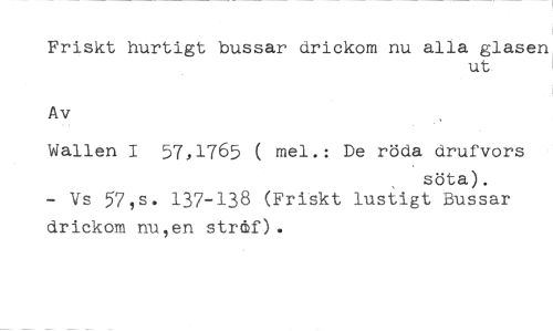 Friskt hurtigt bussar drickom nu alla glasen //// ut //// A //// Wallen I 57,1765 ( mel.: De röda drufvors //// söta). //// - Vs 57,s. 137-138 (Friskt lustigt Bussar //// drickom nu,en strån.