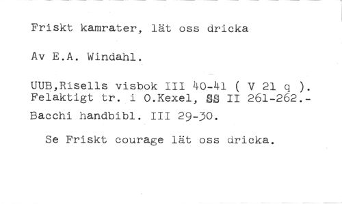 Friskt kamrater, lät oss dricka Av E.A. Windahl. //// UUB,Risells visbok III 40-41 ( V 21 q ). Felaktigt tr. i 0.Kexel, SS II 261-262.- //// Bacchi handbibi. III 29-30. //// Se Friskt courage lät oss dricka.