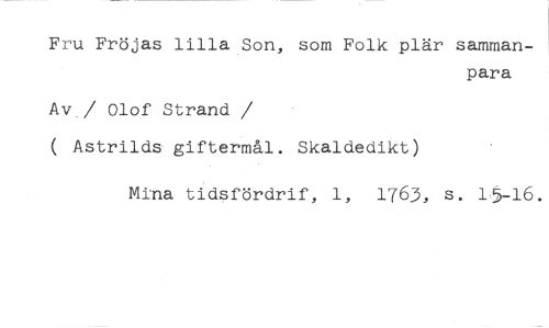 Fru Fröjas lilla Son, som Folk plär samman- //// para //// Av./ Olof Strand //// /( Astrilds giftermål. Skaldedikt) //// Mina tidsfördrif, 1, 1763, s. 15-16.