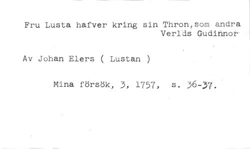 Fru Lusta hafver kring sin Thron,som andra //// Verads Gudihnor //// Av Johan Elers ( Lustan ) //// Mina försök, 3, 1757, s. 36-37.