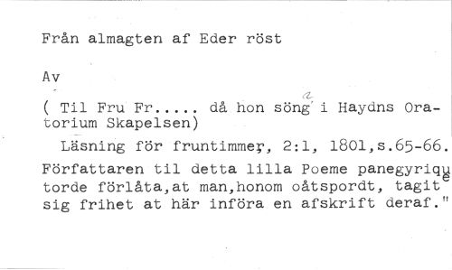 Från almagten af Eder röst Av //// ( Til Fru Fr då hon söng'i Haydns Ora- //// torium Skapelsen) //// Läsning för fruntimme', 2:1, 1801,s.65-66. //// Författaren til detta lilla Poeme panegyriqg torde förlåta,at man,honom oåtspordt, tagit sig frihet at här införa en afskrift deraf."