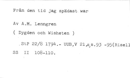 Från den tid jag spädast war //// Av A.M. Lenngren //// ( Dygden och Wisheten //// .StP 22/8 1794.- UUB,V 21,s,s.93 -95(Risell SS II 108-110.
