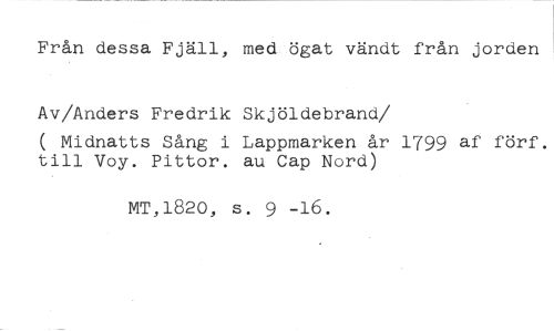 Från dessa Fjäll, med ögat vändt från jorden Av/Anders Fredrik Skjöldebrand //// /( Midnatts Sång i Lappmarken år 1799 af förf. till Voy. Pittor. au Cap Nord) //// MT,1820, s. 9 -16.