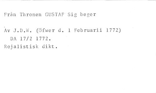 Från Thronen GUSTAF'Sig beger //// Av J.D.W. (Öfwer d. 1 Februarii 1772) //// DA 17/2 1772. //// Rojalistisk dikt.