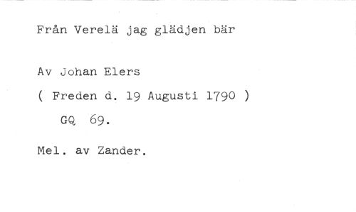 Från Verelä jag glädjen bär //// Av Johan Elers //// ( Freden d. 19 Augusti 1790 ) GQ 69. //// Mel. av Zander.