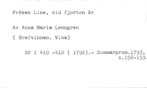 Fröken Lise, vid fjorton år //// Av Anna Maria Lenngren ( Grefvinnan. Visa) //// SS 1 10 -412 ( 1792).- Sommarprom.1793, //// s.158-159,