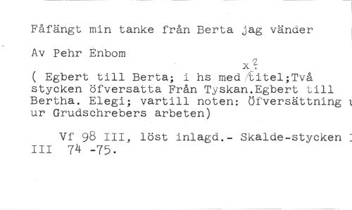 Fåfängt min tanke från Berta jag vänder //// Av Pehr Enbom //// x //// ( Egbert till Berta; i hs med titel;Två stycken öfversatta Från Tyskan.Egbert till Bertha. Elegi; vartill noten: öfversättning i ur Grudschrebers arbeten) //// Vf 98 III, löst inlagd.- Skalde-stycken III 74 -75.