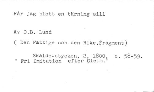 Får jag blott en tärning sill //// Av O.B. Lund //// ( Den Fattige och den Rike. Fragment) //// Skalde-stycken, 2, 1800, s. 58-59. " Fri Imitation efter Gleim."