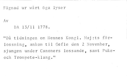 Fägnad ur wårt öga lyser //// Av //// DA 13/11 1778. //// "Då tidningen om Hennes Kongl. Maj:ts förlossning, ankom til Gefle den 2 November, sjungen under Canoners lossande, samt Puke-och Trompete-klang."