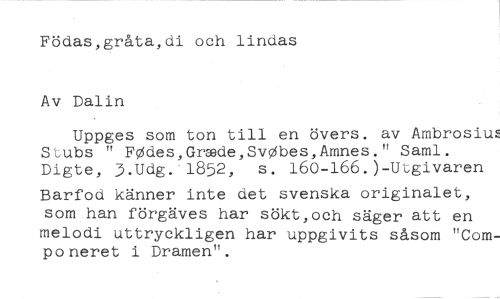 Födas,gråta,di och lindas //// Av Dalin //// Uppges som ton till en övers, av Ambrosiu Suubs " FOdes,Graside,SvObes,Amnes." Saml. Digte, 3.Udg.'1852, s. 160-166.)-Utgivaren //// Barfod känner inte det svenska originalet, som han förgäves har sökt,och säger att en //// melodi uttryckligen har uppgivits såsom "Componeret i Dramen".