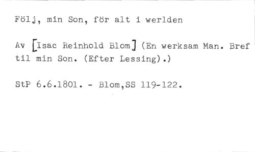 Följ, min Son, för alt i werlden //// Av [Isat Reinhold Blom] (En werksam Man. Bref til min Son. (Efter Lessing).) //// StP 6.6.1801. - Blom,SS 119-122.