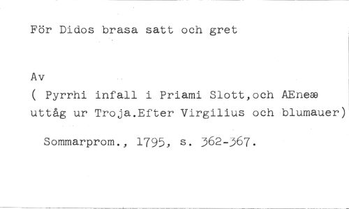 För Didos brasa satt och gret //// Av //// ( Pyrrhi infall i Priami Slott,och AEnem uttåg ur Troja.Efter Virgilius och blumauer) //// Sommarprom., 1795, s. 362-567.