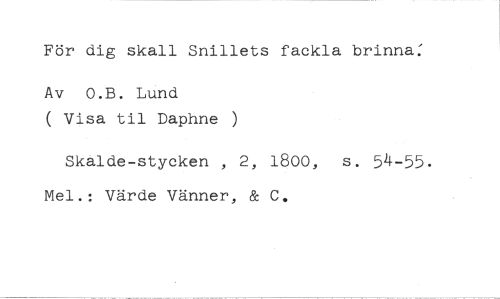 För dig skall Snillets fackla brinna: //// Av O.B. Lund //// ( Visa til Daphne ) //// Skalde-stycken , 2, 1800, s. 54-55. Mel.: Värde Vänner, & C.