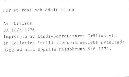 För et rent och ädelt sinne //// Av Crälius //// DA 18/6 1776. //// Impromptu av Lands-Secreteraren Crälius vid //// en kollation intill kronobränneriets nyanlagda //// byggnad nära Uppsala hälsobrunn 9/6 1776.
