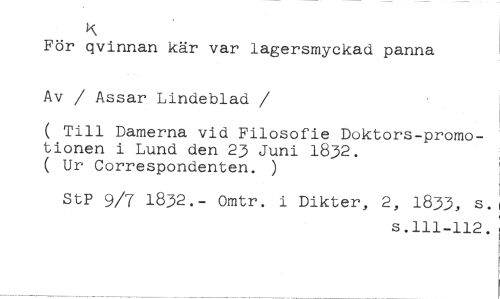 K //// För qvinnan kär var lagersmyckad panna //// Av / Assar Lindeblad //// /( Till Damerna vid Filosofie Doktors-promotionen i Lund den 23 Juni 1832. ( Ur Correspondenten. ) //// StP 9/7 1832.- Omtr. i Dikter, 2, 1833, s.1 //// 3.111-112: