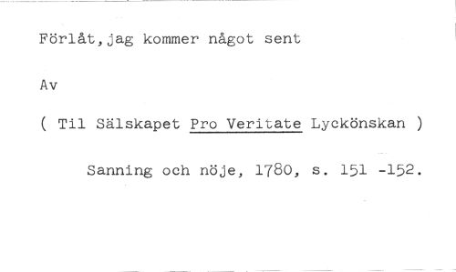 Förlåt,jag kommer något sent //// Av //// ( Til Sälskapet Pro Veritate Lyckönskan ) //// Sanning och nöje, 1780, s. 151 -152.