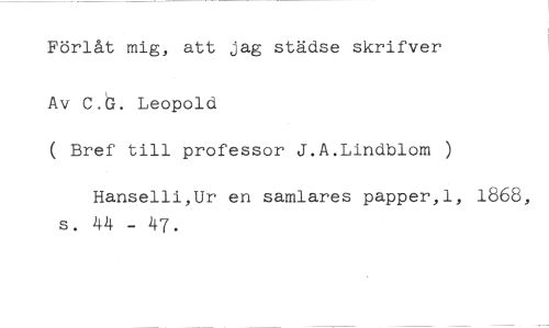 Förlåt mig, att jag städse skrifver //// Av C.G. Leopold //// ( Bref till professor J.A.Lindblom ) //// Hanselli,Ur en samlares papper,l, 1868, s. 4k - 47.